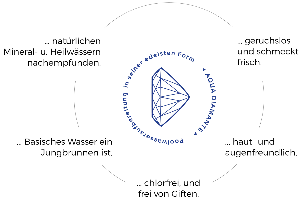 AQUA DIAMANTE ist keine weitere Variante der klassischen Wasseraufbereitung! Im Gegensatz zu allen anderen Poolwasseraufbereitungs-Systemen wird bei AQUA DIAMANTE das Wasser nicht nur konserviert, sondern wirklich gereinigt. Organische Einträge, Bakterien, Schadstoffe etc. werden direkt an der Diamantelektrode im Wasser zu CO₂ verbrannt (oxidiert). Danach bleibt wirklich sauberes Wasser im Pool, ohne Desinfektionsnebenprodukte.
